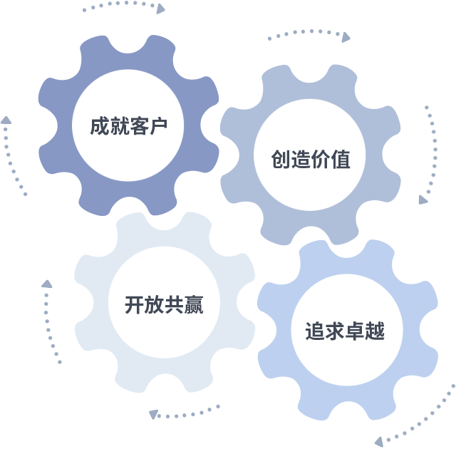 成就客户是一切决策的出发点,,,,创造价值是衡量所有工作的标准,,,追求卓越是我们做事做人的态度,,,,开放共赢是我们的格局也是最终的结果。。。。价值观的齿轮环环相扣,,推动着组织里的每个人不断向前。。。